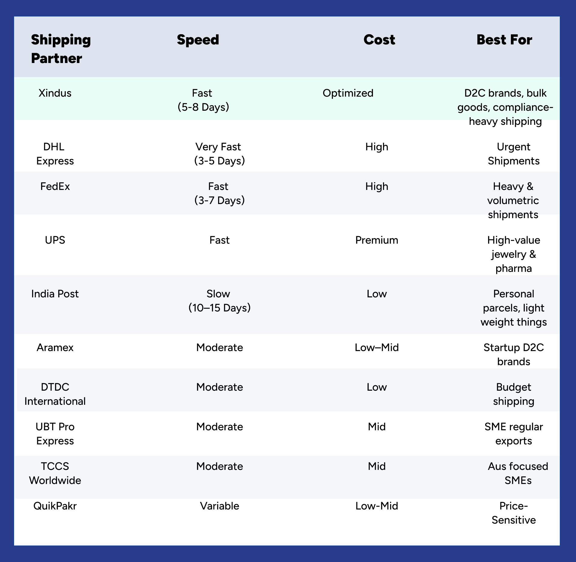 Table comparing India to Australia courier services including Xindus, DHL, FedEx, UPS, India Post, Aramex, and DTDC with transit times, pricing level, and ideal shipment type.