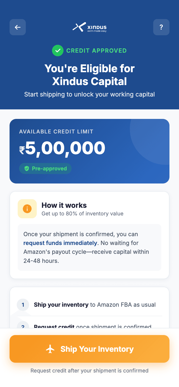 Link your Amazon Seller Account with Xindus. This helps us evaluate your eligibility for Xindus Capital and determine credit limit.